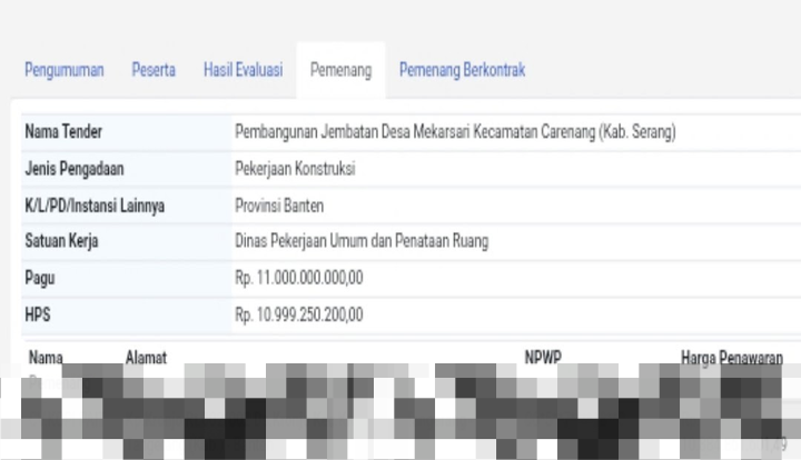 Salah satu contoh yang mencolok adalah CV Kopi Pait, yang telah dinyatakan sebagai pemenang tender untuk pembangunan jembatan di Desa Mekarsari, Kecamatan Carenang, Kabupaten Serang. Proyek ini memiliki nilai pagu anggaran sebesar Rp10,88 miliar, yang berarti melibatkan dana publik dalam jumlah besar.